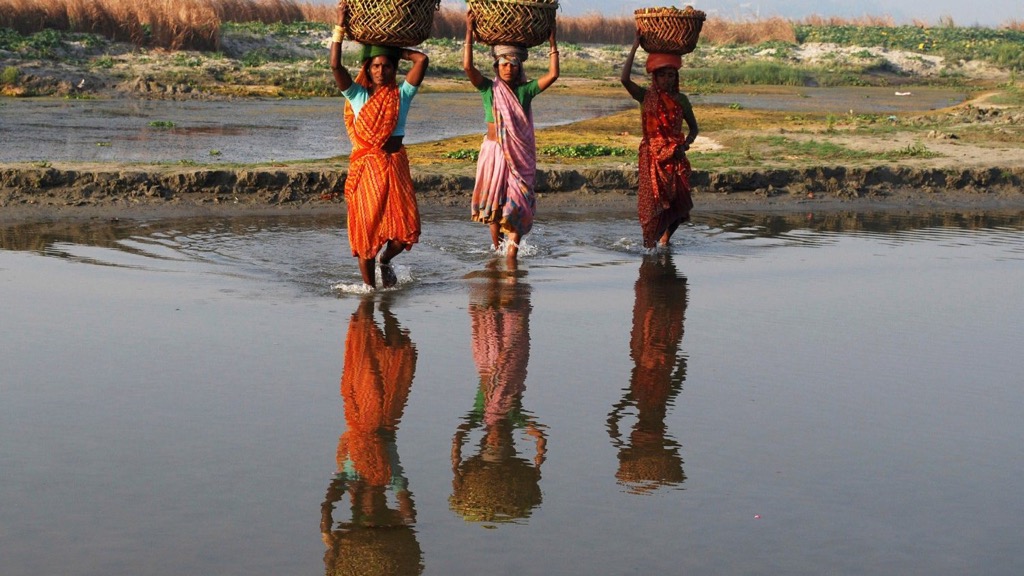 Người nông dân đội những giỏ đựng dưa chuột băng qua dòng nước sông Hằng tại Phaphamau